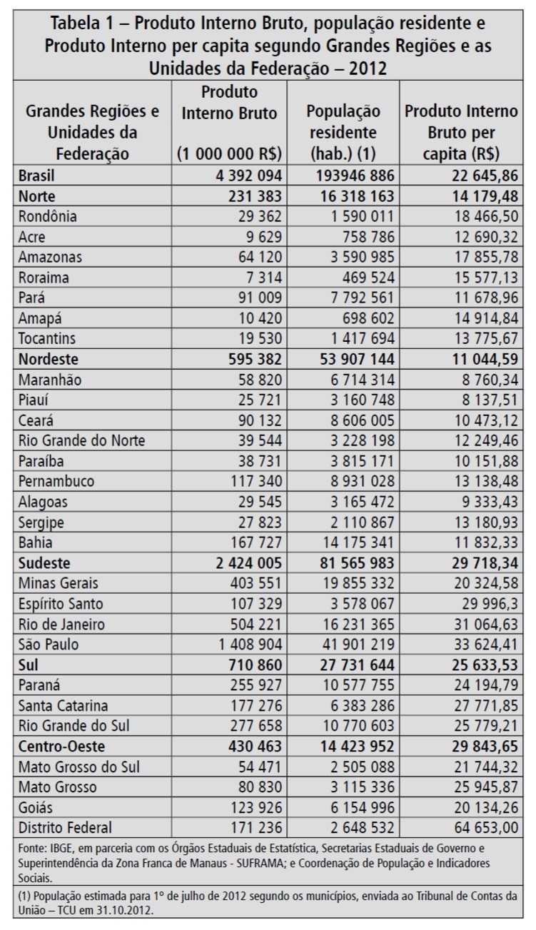 Minas Gerais é a terceira maior economia brasileira no tamanho do Produto Interno Bruto – PIB (R$ 403,551 bilhões, em 2012), ficando atrás apenas dos estados de São Paulo (R$ 1,409 trilhão) e Rio de Janeiro (R$ 504,221 bilhões). Mas no PIB per capita (PIB dividido pelo número de habitantes), principal indicador de riqueza da sociedade, nosso estado desaba, ocupando tão somente 10ª colocação, ficando atrás de Distrito Federal, São Paulo, Rio de Janeiro, Espírito Santo, Santa Catarina, Mato Grosso, Rio Grande do Sul, Paraná, Mato Grosso do Sul. Minas Gerais com PIB per capita de R$ 20.324,58 fica abaixo do indicador nacional de R$ 22.645,86, fica bem abaixo do PIB per capita do Sudeste – R$ 29.718,34 e é o penúltimo colocado, como vimos, dentre os 11 estados do Sudeste, Sul e Centro-Oeste, ficando à frente somente de Goiás. No Índice de Desenvolvimento Humano – IDH, que reúne indicadores de renda, longevidade e educação, a situação não é muito diferente: Minas Gerais ocupa a nona colocação dentre os diversos estados brasileiros, ficando atrás do Distrito Federal, São Paulo, Santa Catarina, Rio de Janeiro, Paraná, Rio Grande do Sul, Espírito Santo e Goiás. Veja as tabelas 1 e 2.
