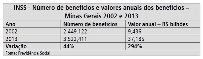 Os números da tabela abaixo mostram que a Previdência Social é, disparado, o maior programa social existente em Minas Gerais e no Brasil. Entre 2002 e 2013, o número de aposentados e pensionistas no Estado passou de 2,449 milhões para 3,522 milhões, um crescimento de 44%. São 2,524 milhões de benefícios urbanos e outros 998 mil benefícios rurais.