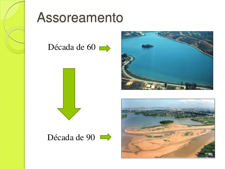 Assoreamento e desassoreamento. O assoreamento é o acúmulo de sedimentos pelo depósito de terra, areia, detritos etc., na calha de um rio, na sua foz, em uma baía, um lago etc., consequência direta de enchentes pluviais. Repaginada por JK com obras arquitetônicas, o reservatório de 18 milhões m³de água e profundidade máxima de 16 metros viveu seu apogeu até 1954, quando a barragem se rompeu. No intervalo de três décadas, apesar de ações para desassorear a lagoa, o acúmulo de sedimentos reduziu a menos da metade o espelho d’água da Pampulha, que passou de 18 km² para menos de 9km². Para o professor Rodrigo Lemos “a Pampulha foi o primeiro manancial para abastecimento humano degradado na Grande BH e cada vez mais se resume a poços d’água confinados nas partes de maior profundidade do reservatório”. A Prefeitura de Belo Horizonte investiu R$ 108 milhões no desassoreamento, que foi concluído em outubro de 2014, e retirou 800 mil metros cúbicos de terra e sedimentos da Lagoa. Trata-se um investimento expressivo, mas que não soluciona os problemas, já que a Lagoa continuará com um intenso processo de assoreamento já que recebe 115 mil metros cúbicos de sedimentos (terra e lixo) por ano, carregados pelos córregos afluentes, o que equivale a 23 mil caçambas. A Prefeitura vai fazer dragagem de manutenção para que o assoreamento não volte a acontecer e uma vez por ano os sedimentos serão retirados.