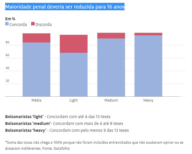 Já o estrato "light" corresponde a um terço dos brasileiros (31%). Demonstra tendências bolsonaristas em apenas, no máximo, quatro quesitos.