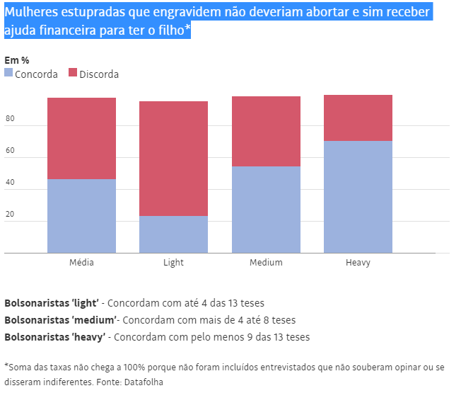 Partindo-se desse pressuposto, por meio de análise de segmentação, é possível a estratificação da amostra em gradientes de adesão a esses temas. O resultado são três grupos distintos —os bolsonaristas "heavy" (intensos), "medium" (medianos) e "light" (leves).