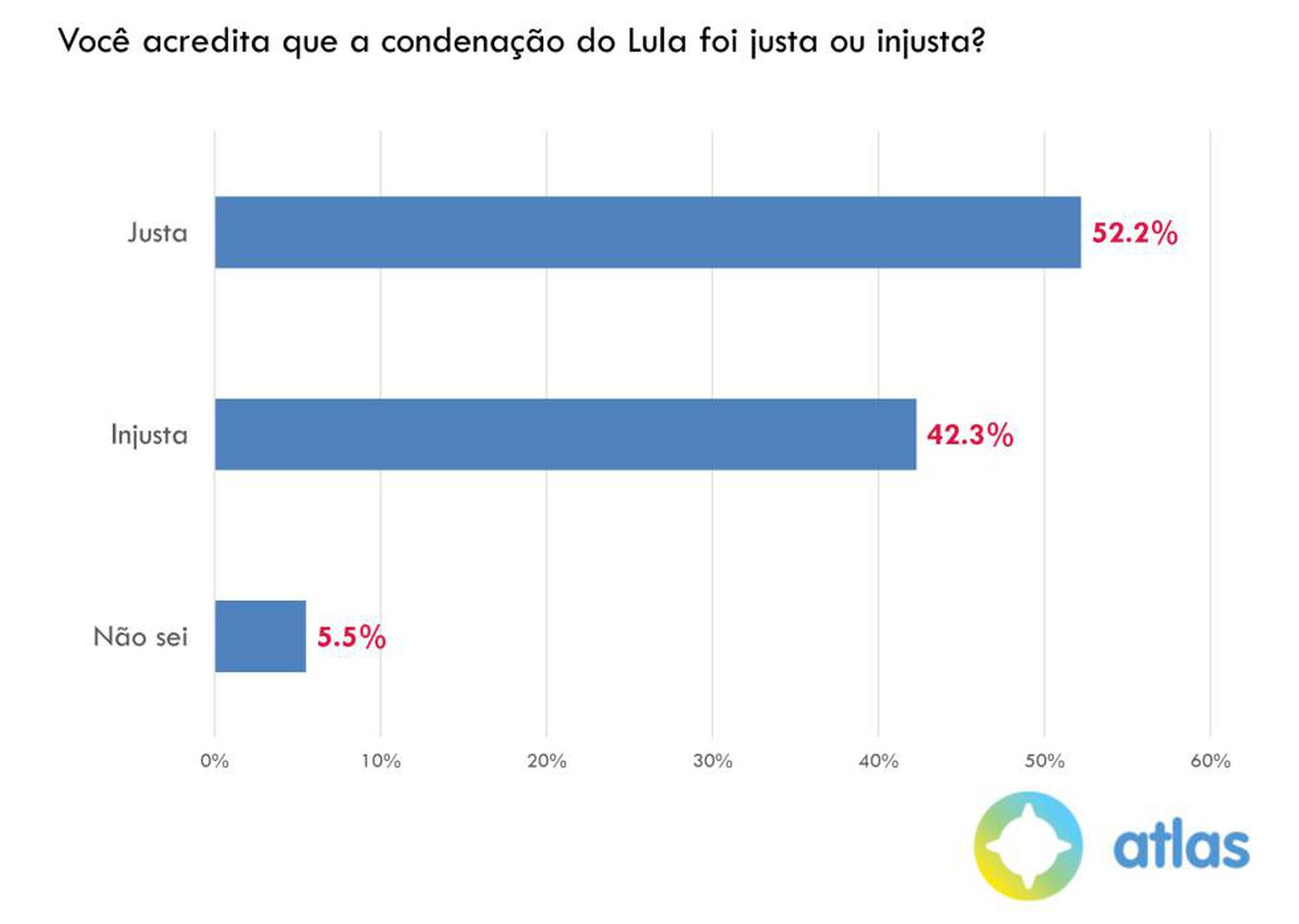 Ainda sobre a condenação que levou Lula à cadeia por 580 dias, a pesquisa mostra alguns resultados aparentemente contraditórios. Enquanto 47,8% se mostram a favor de sua prisão e 44,4% contra, 52,2% dizem que ela foi justa, ao passo que 42,3% acreditam que foi injusta. "Isso sugere que uma parcela chave da população considera que Lula já pagou o suficiente pelos erros que consideram tê-lo levado a sua condenação", explica o cientista político Andrei Roman, fundador da Atlas. Roman observa que esse grupo se mostra "disposto a perdoar" o líder petista.